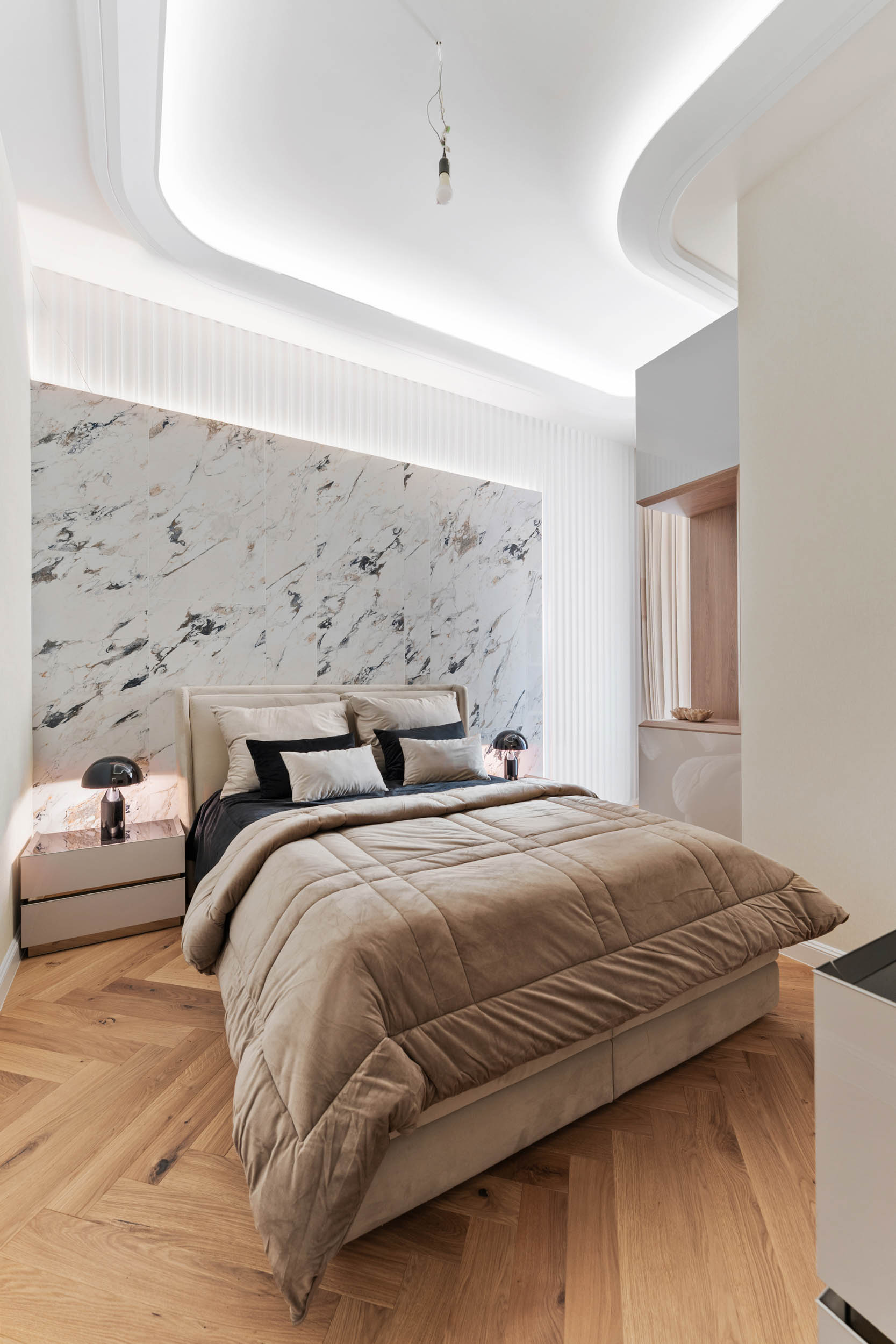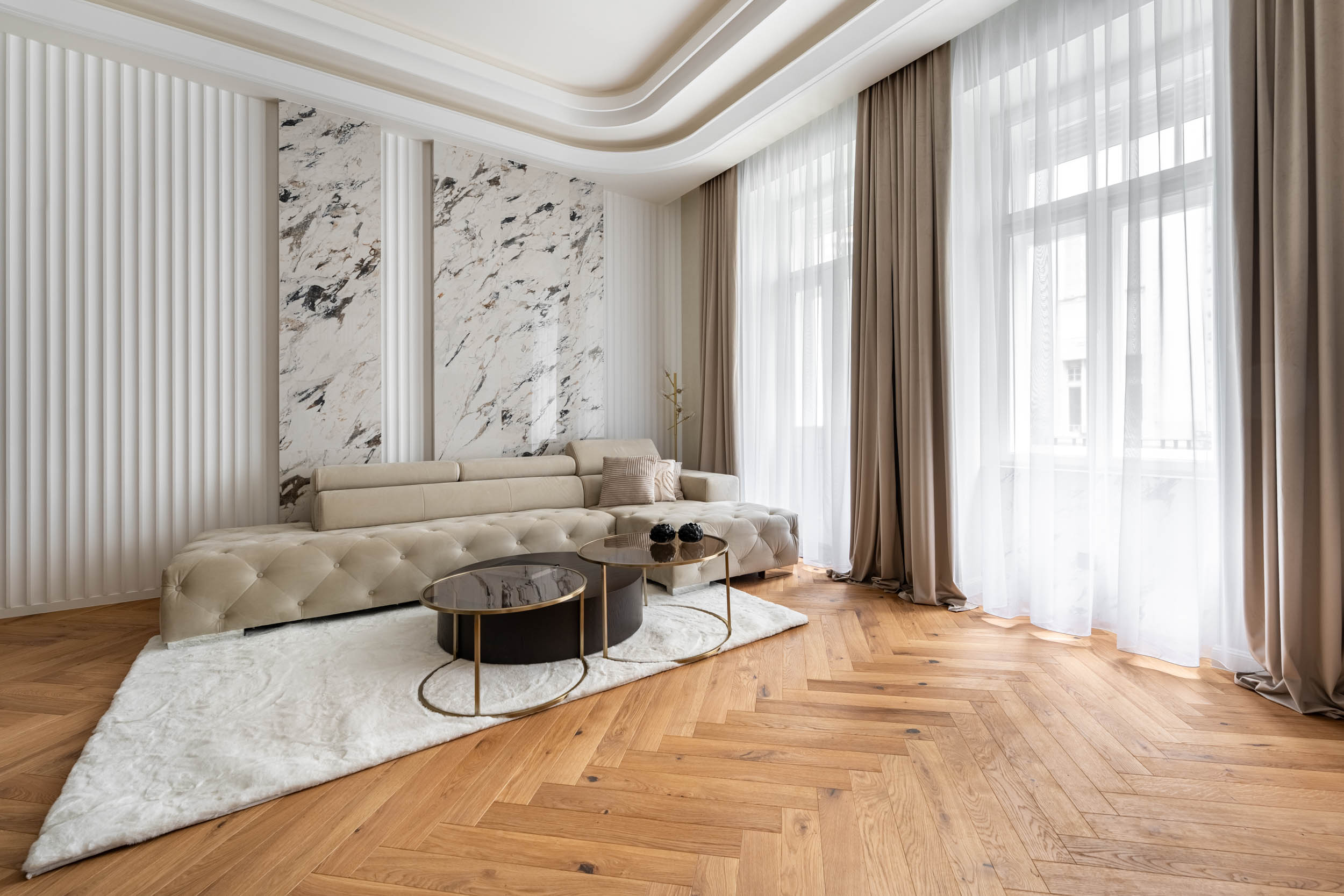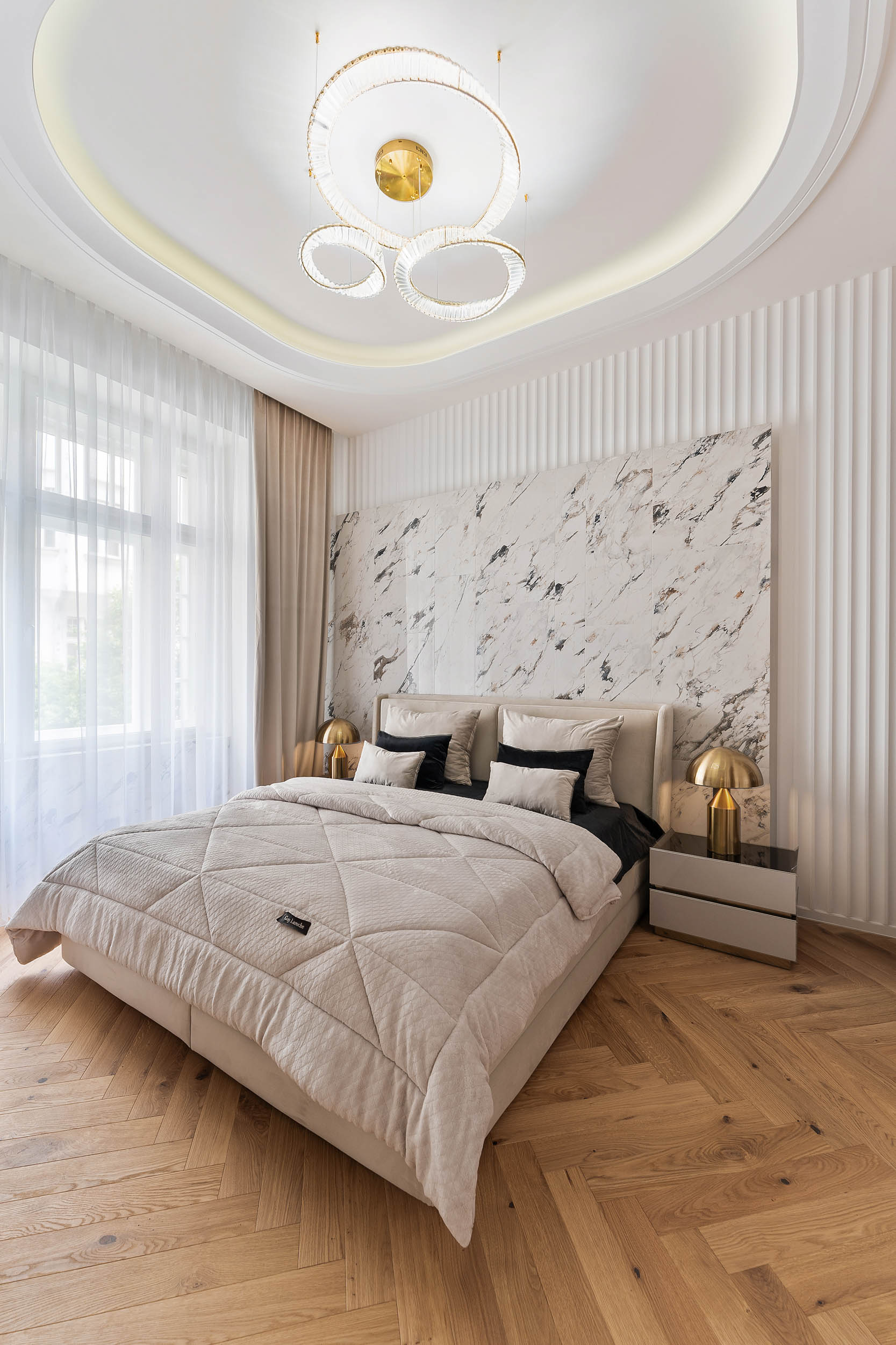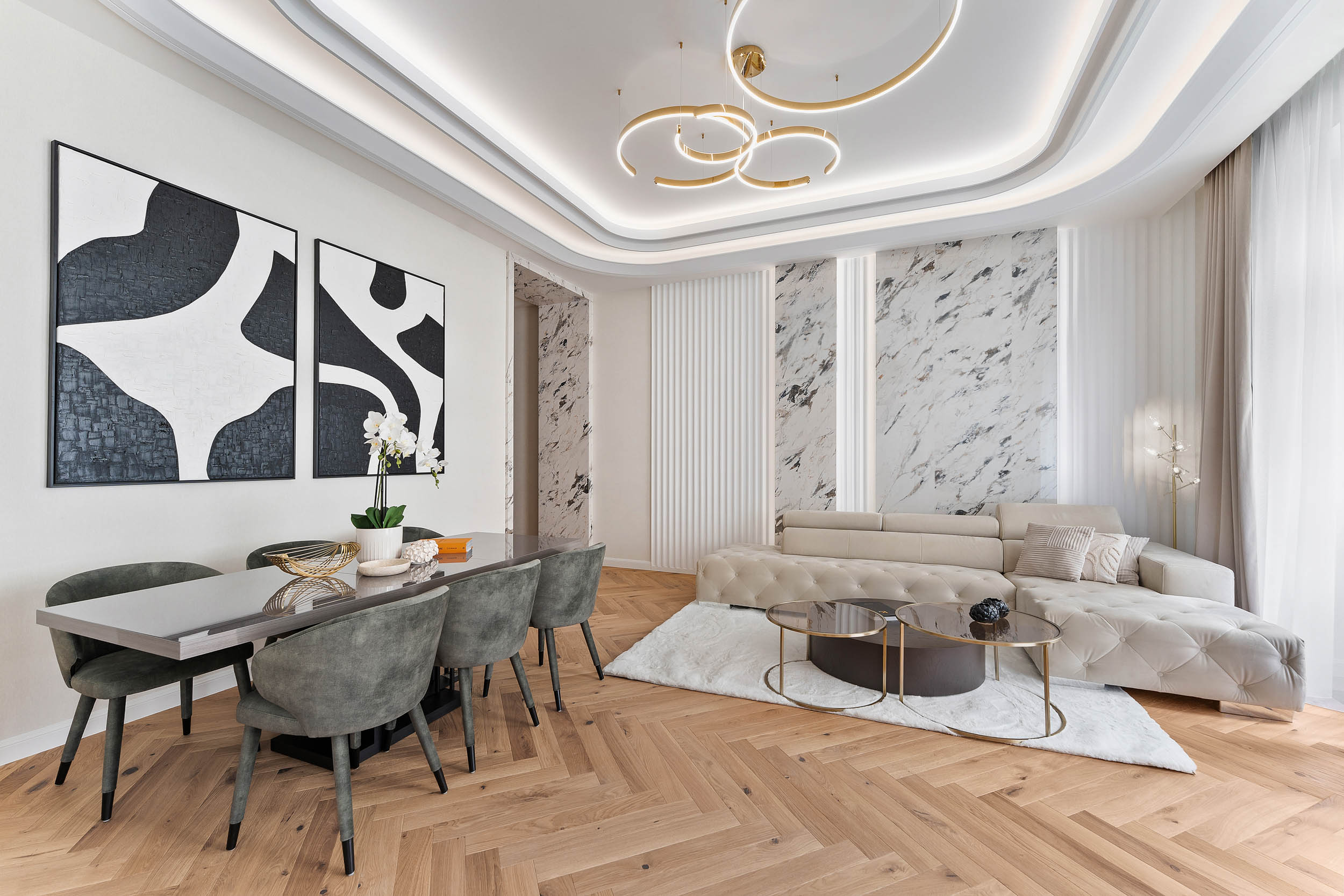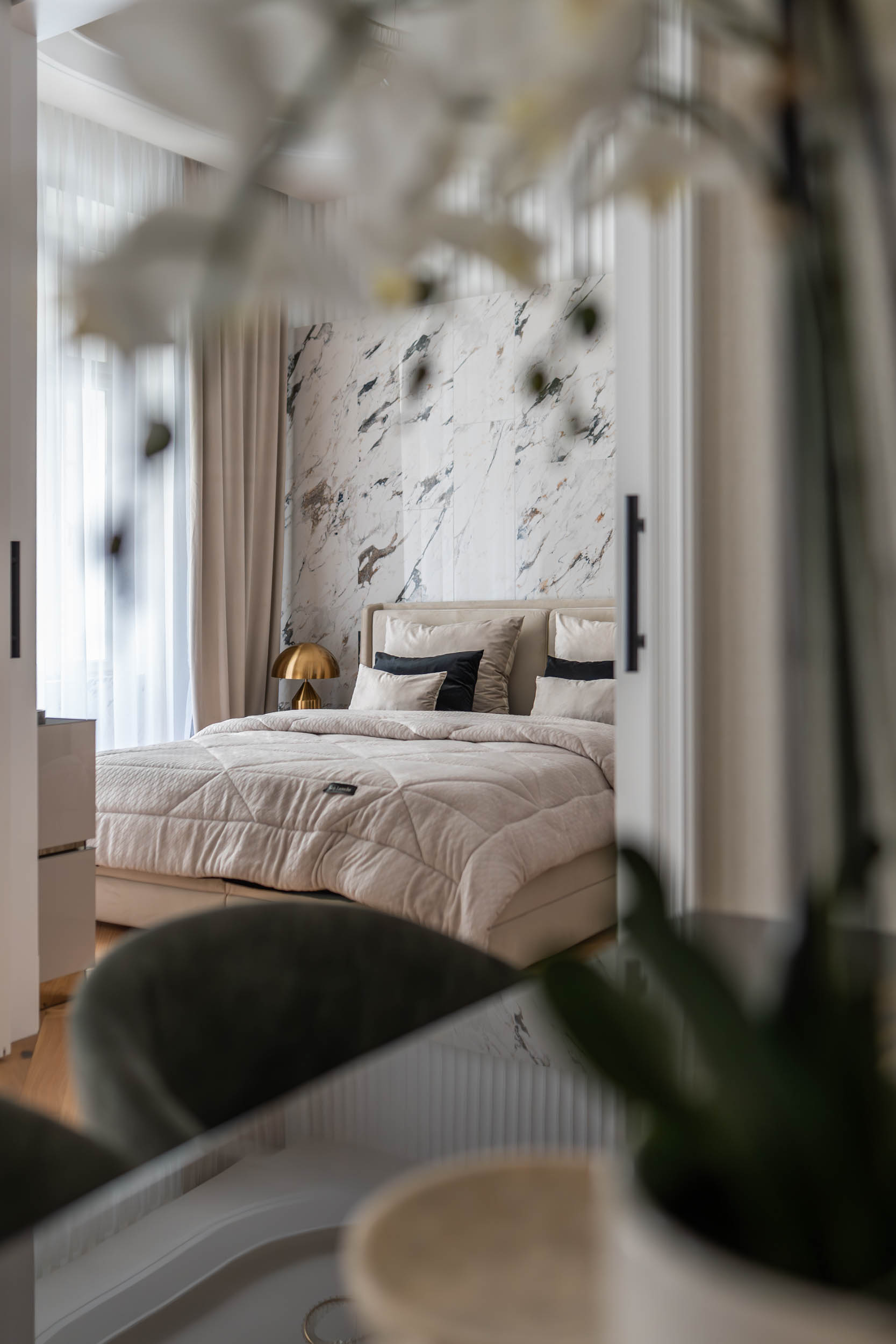 A tágas, amerikai konyhás nappali ideális helyszíne a családi és baráti összejöveteleknek. A modern,  Marburg mosható tapétával borított falak finom eleganciát sugároznak minden helyiségben, csakúgy, mint az Edelholz halszálka parketta, mely a hálószobákban, valamint a nappaliban került lerakásra.  A lakás 3 hálószobából és 2 fürdőszobából így kényelmes és praktikus elrendezést biztosít a család minden tagjának. A fürdőszobák exkluzív burkolatokkal és modern berendezésekkel lettek felszerelve.