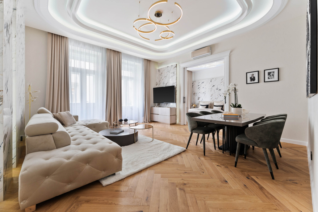 A nappaliban és hálószobákban smart TV-k , klímák kerültek beépítésre. A lakást neves designerek dekorációi (Kare, Bo Concept, Einholtz stb.) teszik igazán modern hangulatúvá.